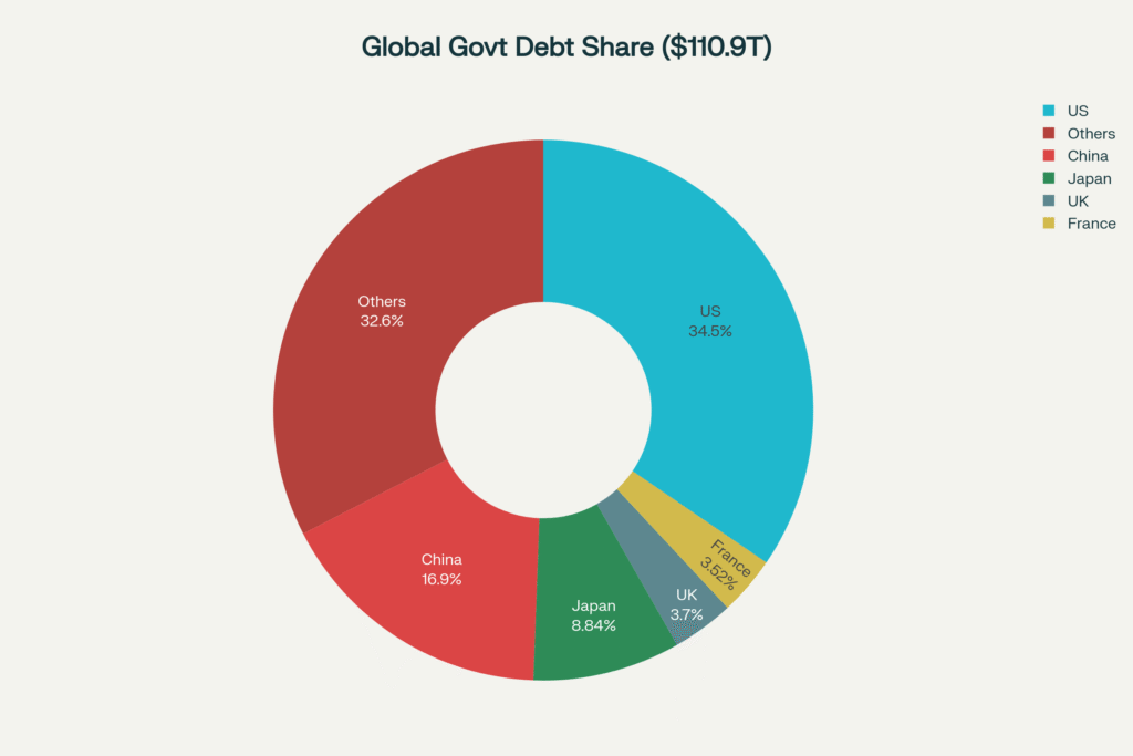 2025 में कुल वैश्विक सरकारी कर्ज़ $110.9 ट्रिलियन तक पहुँच गया है। अमेरिका अकेले $38.3 ट्रिलियन के कर्ज़ के साथ शीर्ष पर है, जो वैश्विक कर्ज़ का लगभग एक-तिहाई है। चीन $18.7 ट्रिलियन के साथ दूसरे और जापान $9.8 ट्रिलियन के साथ तीसरे स्थान पर है। ये तीन देश मिलकर वैश्विक कर्ज़ का 60% हिस्सा रखते हैं।